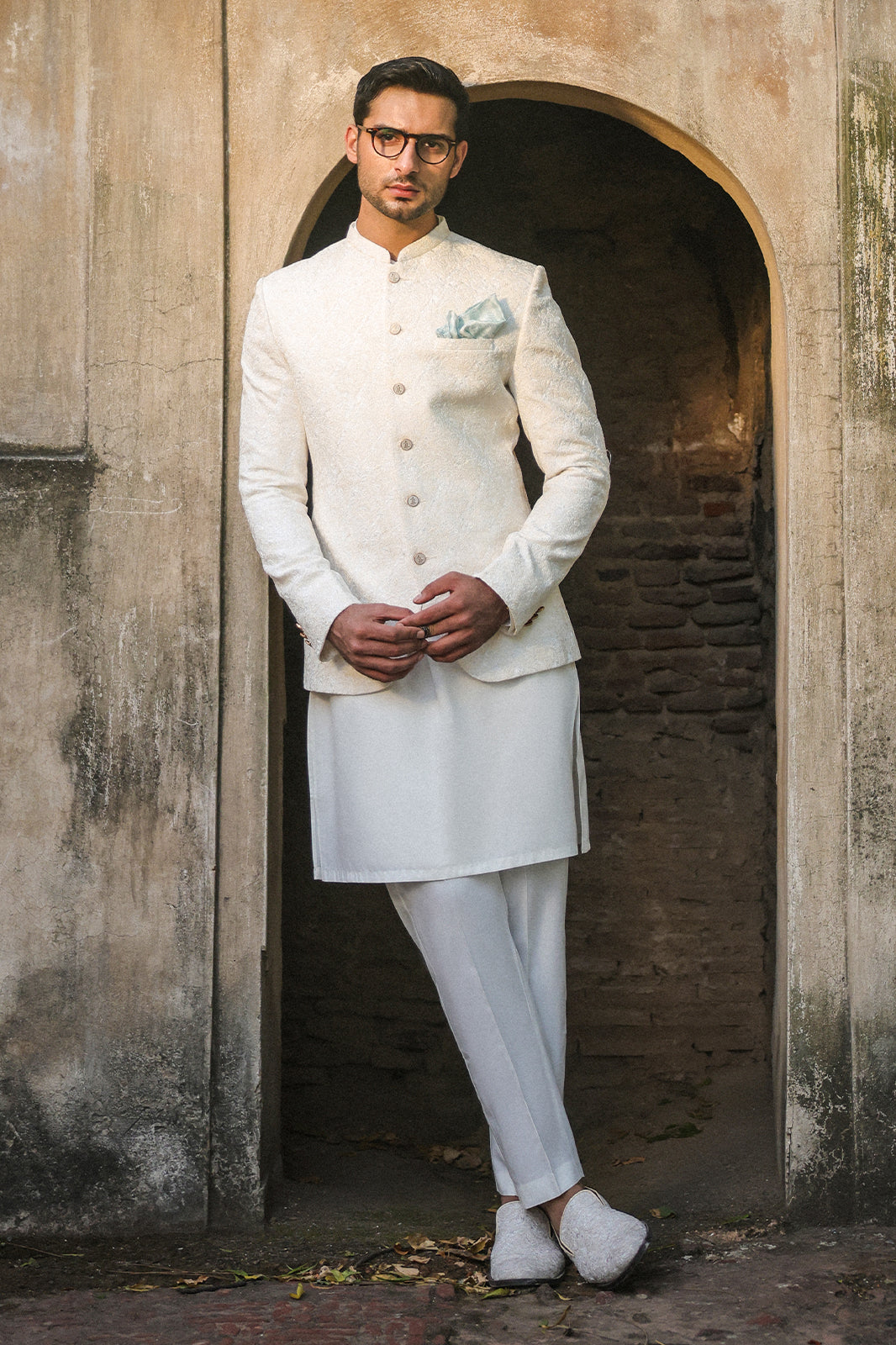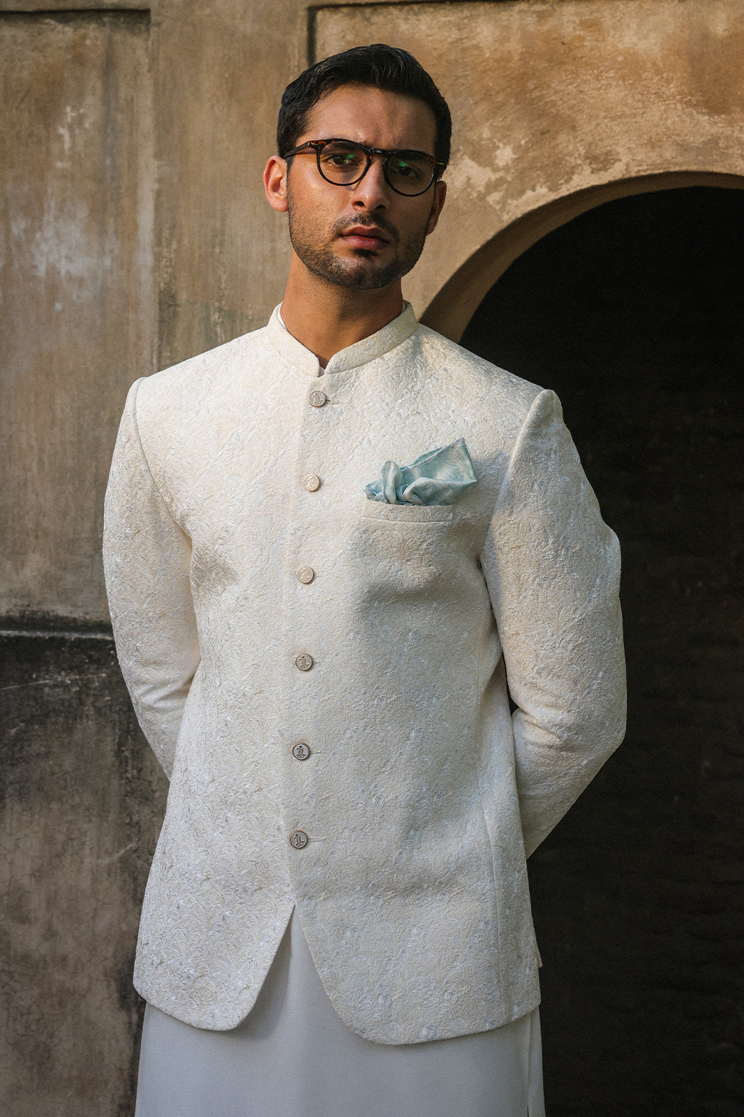 OFFWHITE SELF EMBROIDRED PRINCE COAT